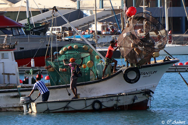 Nous sommes maintenant sur le quai. Les pêcheurs sortent les thons de la cale ...