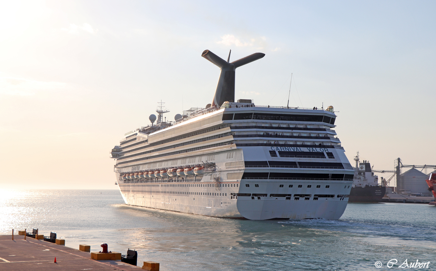 Sue le quai, en face du Boréal, un navire de croisière, le Carnival Valor ( 290 m, 13 ponts, 3000 passagers) est amarré. Depuis notre balcon, nous nous amusons à voir arriver en courant et en musique (hurlante !), les passagers qui reviennent de la plage.